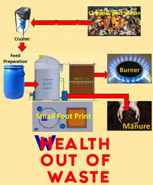 Get bio Gas equalling 8 Kg LPG and 100 ltr Manure every day from 200 Kg of Organic Wet waste/ Day in a 10 x 15 ft Room.